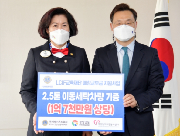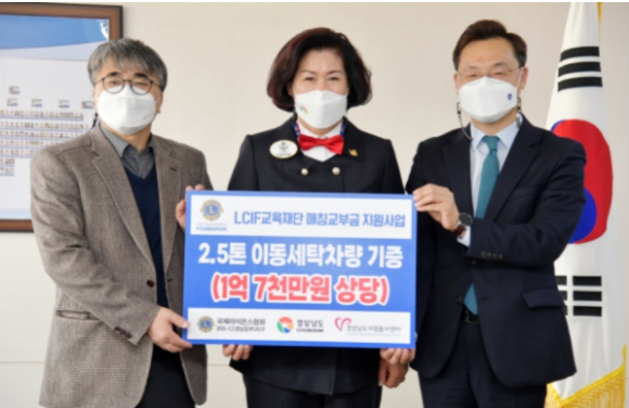 | 국제라이온스협회 경남중부지구가 기증하는 이동세탁차량은 내부에 세탁기, 건조기를 설치하고 3월에 경상남도자원봉사센터에 전달된다. 이동세탁차량은 재난지역 구호활동, 취약계층 세탁지원 등에 활용될 예정이다.