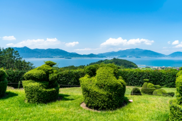 ▲ 토피아랜드(남해) = 나뭇가지를 다듬어 여러 가지 모양을 만들어 낸 우리나라 최초의 토피어리 테마정원인 토피아랜드는 울창한 편백나무 숲에서 피톤치드를 만끽하면서 푸른 남해 앞바다를 시원하게 조망할 수 있는 공원이다. 야생화와 상록수가 많아 사계절 내내 푸른 공원이며, 곳곳의 포토존은 인생사진을 남기기에 더할 나위 없는 곳이다.