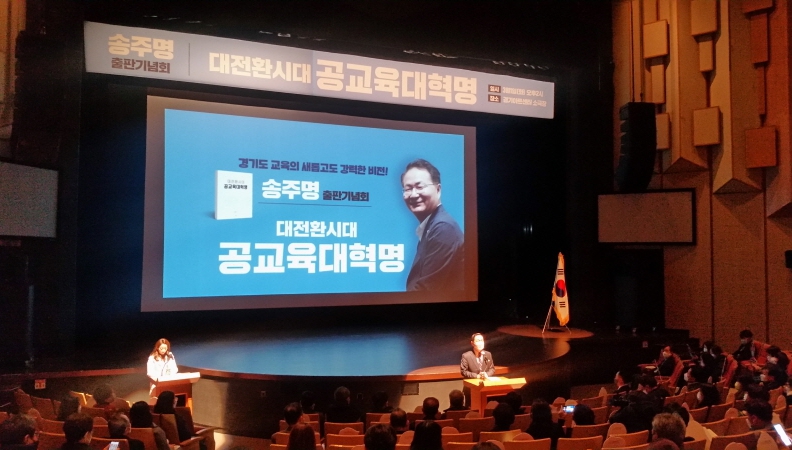 송주명 한신대교수 겸 민주주의학교 상임대표가 1일 경기아트센터 소극장에서 저서 ‘대전환시대 공교육대혁명’ 출판기념회를 열고 오는 6월 1일 치러지는 경기도 교육감 선거 출마를 위한 본격적인 행보에 나섰다. 이번 북콘서트는 교육계 및 노동계, 시민사회단체, 전·현직 지자체장, 시·도의원 등 각계인사 천여명이 참석해 성황을 이뤘다.