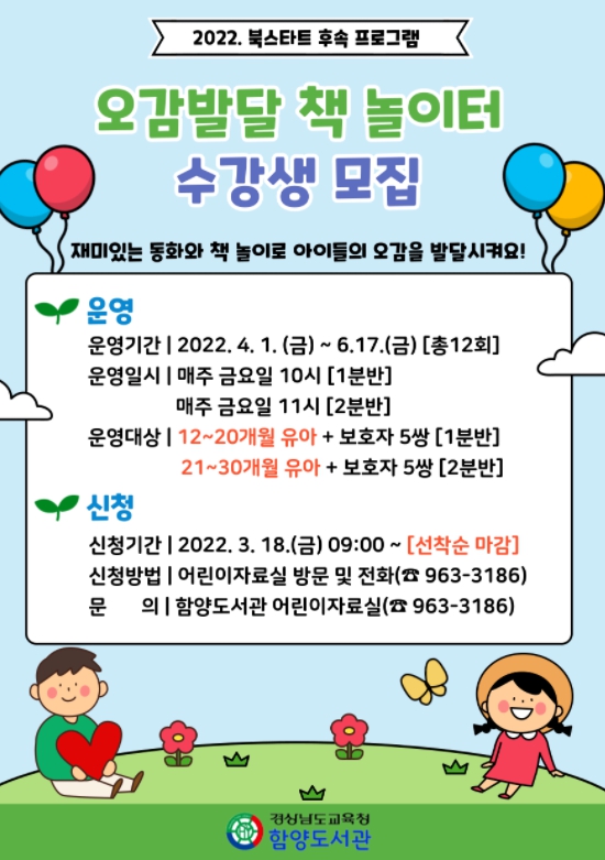 함양도서관, 유아 책 놀이 프로그램 수강생 모집- 12~30개월 유아 대상 오감발달 책 놀이터, 3월 18일부터 접수 -최정현 기자 / |