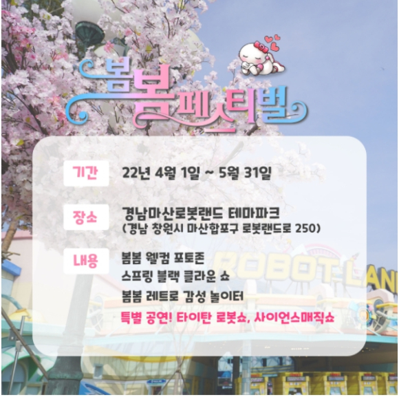 또한 각종 봄맞이 벚꽃 조형물이 설치되어 있어 봄의 향기를 만끽함과 동시에 로봇 광장과 테마파크 곳곳에 전시된 산업용 폐자재로 만든 ’정크 아트 로봇‘들은 로봇랜드라는 테마에 부합하게 필수 인증샷 코스로 꼽힌다.