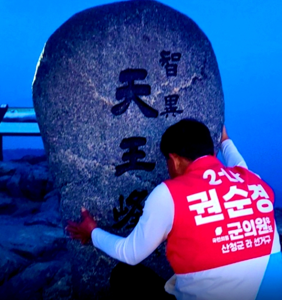 산청군의원 권순경 후보의 이색적 선거운동 `눈길`지리산 천왕봉 정상에서 공약을 바칩니다"김철상 기자 / |