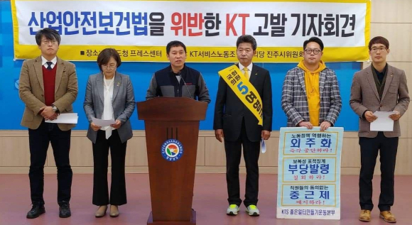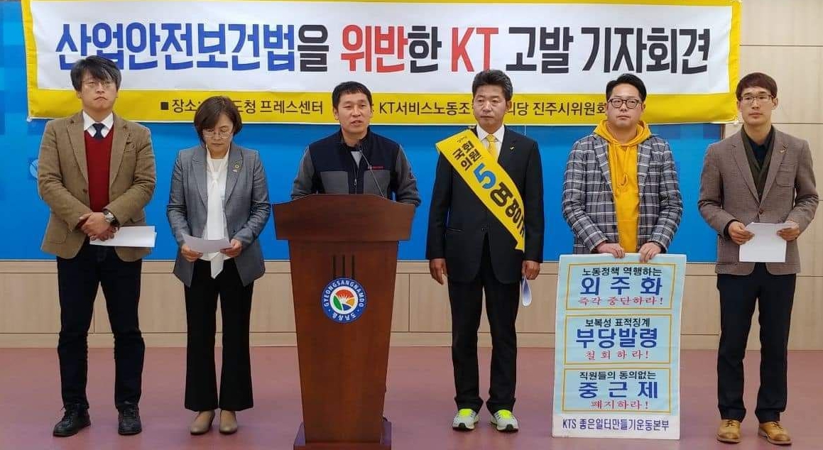특히 지난 2019년 3월 4일 경남도청프레스센터에서 정의당 진주시위원회(당시 위원장 김용국), KT서비스노동조합은 KT황창규 회장, KT서비스 남부, 북부 대표를 산업안전보건법 위반으로 노동청에 고발하는 기자회견을 가지는 등 평소에도 노동 안전에 대한 활동을 진행해오고 있다. |