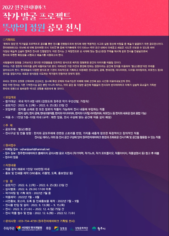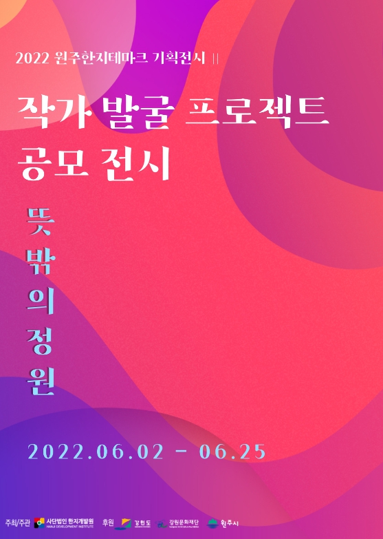 필(必)환경 시대, 전시 지원 공모전 ‘뜻밖의 정원’ 작가 모집(사)한지개발원은 독창적인 한지예술가 발굴과 지원을 위한 공모 전시 ‘뜻밖의 정원’에 참여할 작가를 모집한다.정유근 기자 / |