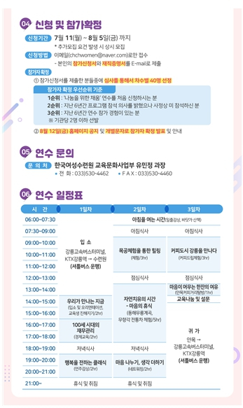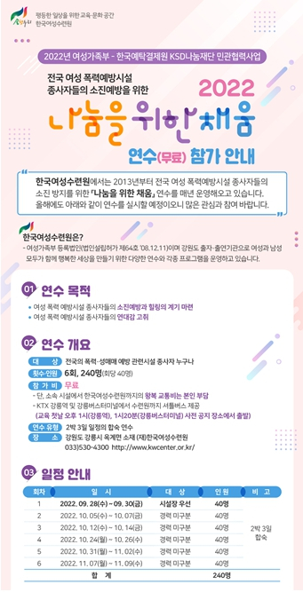 (재)한국여성수련원, 전국 젠더폭력예방시설 종사자 위한 소진예방 힐링연수 ‘나눔을 위한 채움’참가자 모집▶ 전국 젠더폭력예방시설 종사자들을 위한 소진예방 힐링연수 ‘나눔을 위한 채움’ 운영▶ 9월부터 11월까지 총 6회, 전국 240명 대상으로 운영 정유근 기자 / |