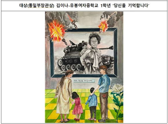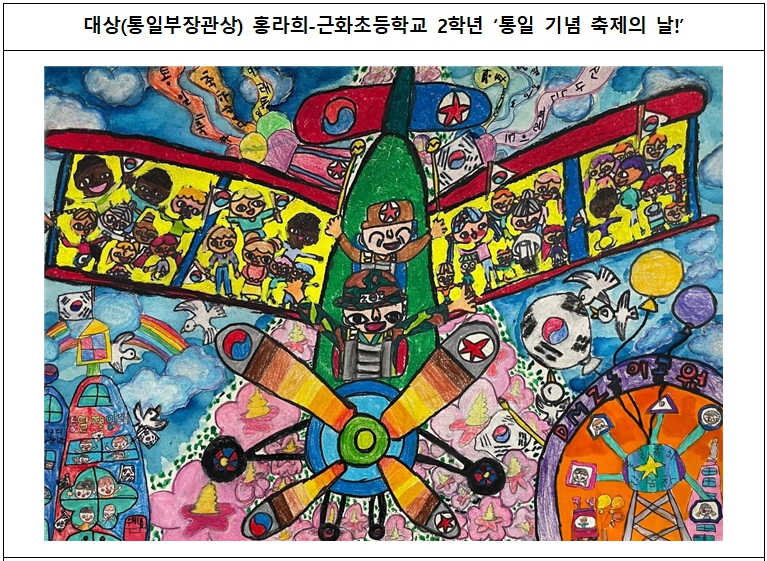 | 올해 공모전은 전국에서 많은 학생들이 DMZ를 주제로 다양하고 창의적인 작품들을 선보였으며, 전문가 심사를 거쳐 홍라희(근화초등학교 2학년) 학생의 ‘통일 기념 축제의 날!’과 김이나(유봉여자중학교 1학년) 학생의 ‘당신을 기억합니다’가 대상(통일부장관상)을 수상하는 영예를 안았다. 이외에 모두 197점의 수상작이 선정되었다.