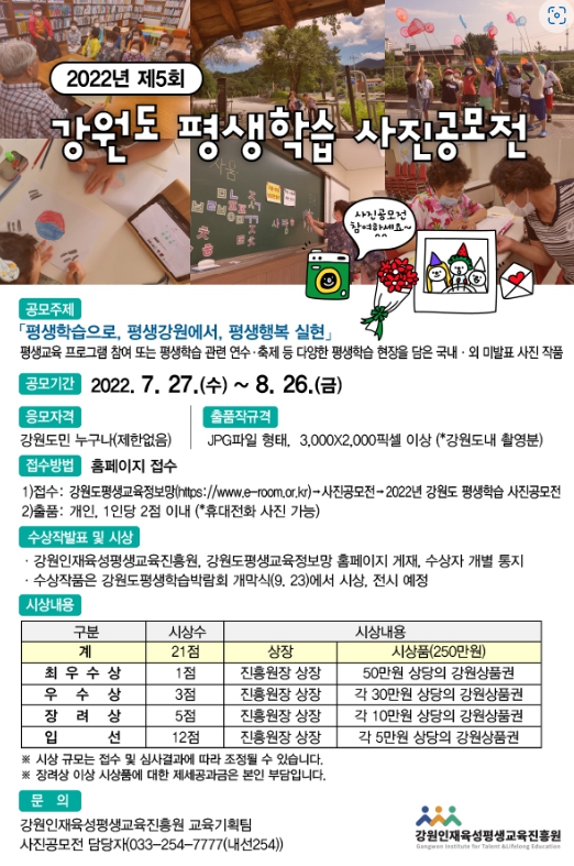 강원인재육성평생교육진흥원(원장 손인주)은 강원도민을 대상으로 생활속 평생학습 실천과 평생학습 문화확산을 위하여「2022년 강원도 평생학습 사진공모전」을 개최한다.