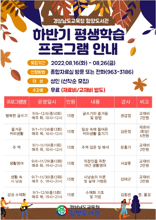 경상남도교육청 함양도서관(관장 배희영)은 지역주민들에게 흥미롭고 유익한배움과 자기계발의 기회를 제공하기 위하여 2022년 하반기 평생학습·별밤 프로그램 수강생을 모집한다.