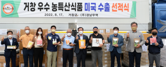 거창군은 17일 남상면 소재 ㈜농업회사법인 하늘바이오(대표 윤효미)에서 구인모 거창군수를 비롯한 관계자 11명이 참석한 가운데 ‘거창군 농특산식품 미국 온·오프라인 안테나숍 운영’을 위한 미국 수출 선적식을 가졌다.