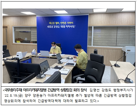 김명선 강원도 행정부지사, 양구군 양돈농가 아프리카돼지열병발생에 따른 긴급 차단방역 총력 주문❶ 8.18일 양구군 양돈농가에서 비육돈 폐사신고, 검사결과 양성 확진❷ 모든 역량을 집중하여 농장 추가 확산을 차단하기 위한 선제적이고 과감한 초동방역 조치에 총력 정유근 기자 / |