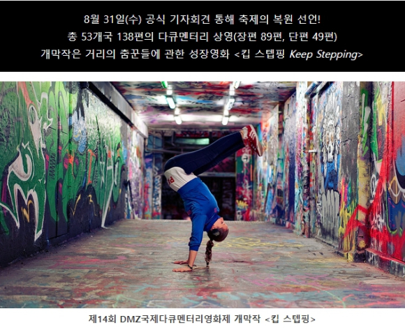 | 개막작 – 좌절의 시대에 용기를 북돋우는 댄스 다큐멘터리 <킵 스텝핑 Keep Stepping> 제14회 DMZ Docs의 개막식은 9월 22일(목) 임진각 평화누리 야외공연장에서 열린다. 올해 개막식은 경기문화재단 Let`s DMZ와의 협업으로 진행된다. 올해 개막작은 루크 코니시 감독의 <킵 스텝핑>으로 거리의 춤꾼들을 소재로 한 다큐멘터리이다. 호주 최대 스트리트 댄스 경연대회에 출전한 두 명의 이민자 여성 댄서들의 우정 어린 경쟁, 더 나은 내일을 위해 분투하는 과정을 그렸다. 장병원 수석 프로그래머는 “단지 춤에 관한 다큐멘터리가 아니라 비 주류의 정체성을 가진 이들이 결코 멈추지 않고 계속 전진하는 모습을 묘사함으로써 깊은 감동과 영감을 준다”라고 선정의 변을 밝혔다. 개막작 감독 루크 코니시, 압도적인 카리스마를 뿜어내는 브레이크 댄서 패트리샤 카르멘 크라스마루크, 스트리트 댄스 경연대회 설립자이자 댄서인 조 원이 개막식에 맞춰 DMZ Docs를 방문할 예정이고, 영화제 기간 GV, 무대인사 등을 통해 관객과 만난다.