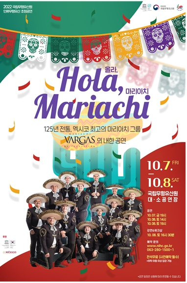 문화재청 국립무형유산원(원장 이경훈)은 한국과 멕시코 수교 60주년을 기념하여 멕시코 대표 무형유산 ‘마리아치’ 악단을 초청, 를 오는 10월 7일(금)부터 8일(토)까지 이틀간 국립무형유산원 얼쑤마루 대공연장(전북 전주시)에서 공연한다.