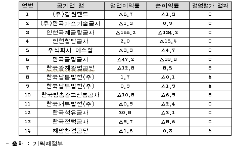 ❍ 그런데도 공기업의 성과급 지급은 계속해서 이뤄지고 있는 것으로 드러났다. 김 의원이 입수한 자료에 따르면, 36개 공기업 중 14개 공기업은 영업이익률이나 순이익률이 적자를 기록했음에도 성과급을 받을 수 있는 ‘C’등급 이상의 평가를 받아 성과급을 챙긴 것으로 나타났다.