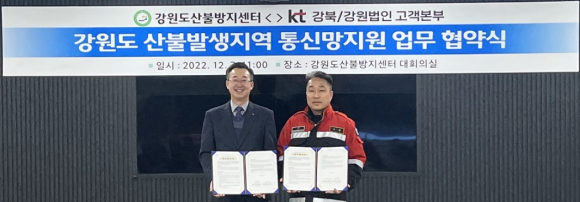 12월 7일 11시 강원도산불방지센터 대회의실에서 강원도산불방지센터와 KT강북/강원법인고객본부는 강원도 내 산불발생 지역의 신속한 통신망 지원을 위한 업무협약(MOU)을 체결하였다.