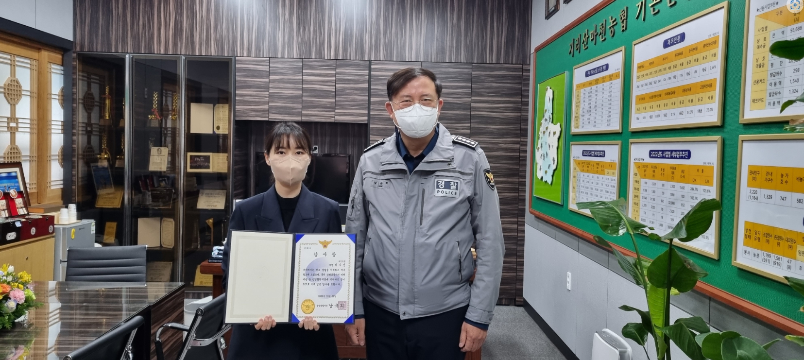 함양경찰서(서장 남규희)는 12. 6.(화). 10:00경 지리산마천농협에 방문하여 전화금융사기(보이스피싱) 피해를 예방한 박수진 계장에게 감사장을 수여했다.