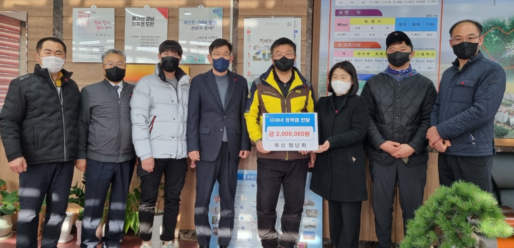 합천읍 「옥산 청년회」 다자녀 장학금 전달- 옥산동에 주소를 둔 다자녀 가구 2세대에 총 2백만원 전달해 -이광훈 기자 / |