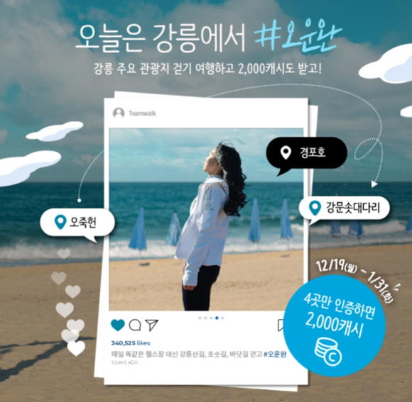 | 이번에 오픈된 2개 코스의 걷기 챌린지는 내년 1월 31일까지 운영되며, 이후에 9개 전 코스 대상으로 확대 운영될 예정이다. 참여 방법 등 자세한 사항은 캐시워크가 운영하는 B2B 플랫폼 팀워크에서 확인이 가능하다.