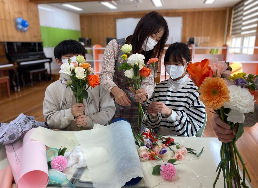 그 다음 3학년부터 6학년 학생들을 대상으로 졸업 축하 꽃다발 만들기 체험활동을 하였다. 3학년~5학년은 6학년 5명 졸업생을 위한 꽃다발, 6학년은 유치원 수료 및 졸업하는 동생들을 위한 꽃다발을 만들었다.