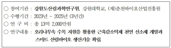 | 강원도산림과학연구원은 지난 2021년 스마트산림바이오 혁신성장 거점 공모사업에 선정되어 200억원의 예산을 확보하였고, 이 사업과 관련된 첫 번째 산학연 공동 연구사업으로 국내 오리나무를 이용한 연구를 수행할 수 있게 되었다.