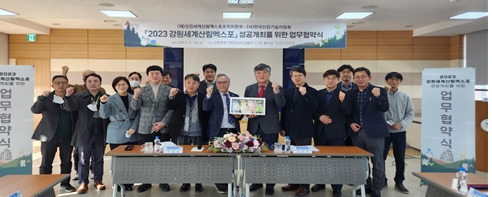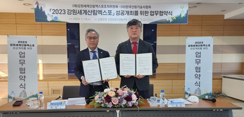 (재)강원세계산림엑스포조직위원회(위원장 김진태)는 『2023 강원세계산림엑스포』 성공적 개최를 위하여 1월 10일 14시 신한은행 강원영업부금융센터 7층 회의실에서 (사)한국산림기술사협회(회장 박길동)와 업무협약을 체결했다.