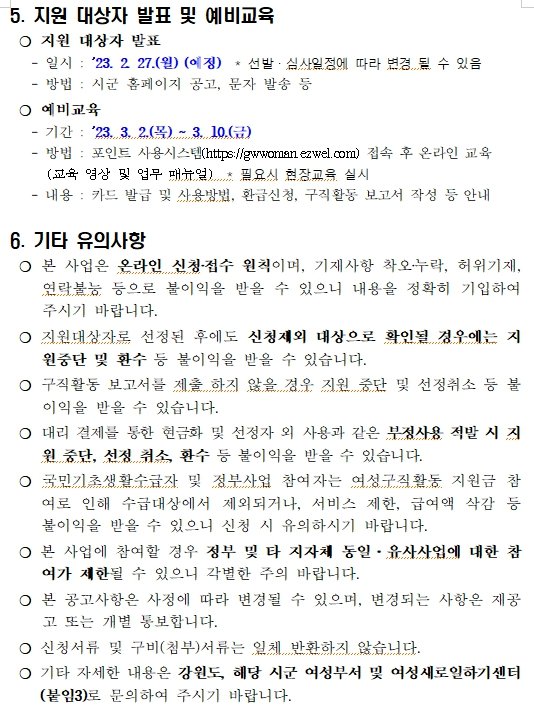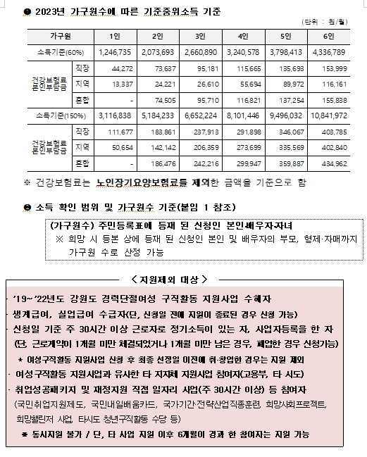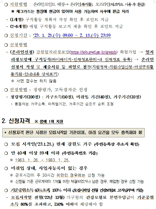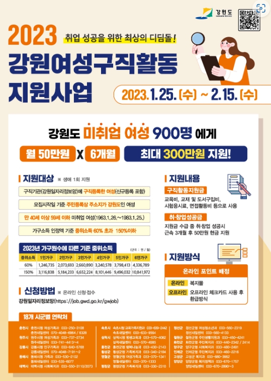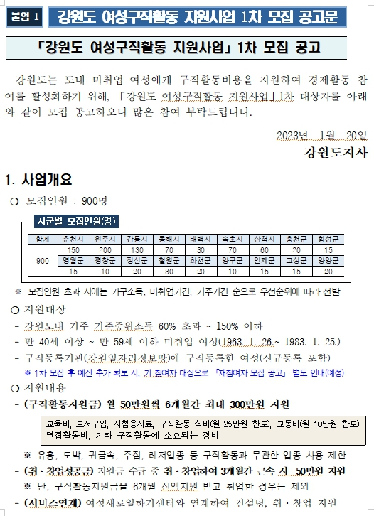 강원도는 도내 미취업 여성의 경제활동 참여를 활성화하기 위해‘강원도 여성구직활동 지원사업’1차 대상자 900명을 모집한다. -‘강원도 여성구직활동 지원사업’은 강원도가 경력단절 등으로 취업에 어려움을 겪고 있는 도내 구직여성을 대상으로 총 300만원의 구직활동지원비*와 취업 지원 서비스**를 제공하는 사업이다. * 월 50만원씩 6개월간 최대 300만원 지원(직업교육훈련비, 자격증 취득비 등 사용) ** 여성새로일하기센터와 연계하여 컨설팅, 취·창업 지원 - 신청자격은 모집 시작일(‘23.1.25.) 기준, 도내 취업을 희망하는 만 40세 이상 만59세 이하(1963.1.26.~1983.1.25.) 미취업 여성으로 기준중위소득 60%초과 150%이하 기준을 충족하여야 하며 - 참여신청은 1월 25일부터 2월 15일까지 강원일자리정보망https://job.gwd.go.kr/gwjob을 통해 온라인으로 구직정보를 사전 등록하여야 한다. 통계자료에 따르면 40대이상 중장년 여성이 재취업까지 평균 12개월 이상 소요되는 현실을 감안, 강원도는 금년부터 1차 모집(신규신청자) 후 예산을 추가로 확보하고 기 수혜자에게도 재참여 기회를 부여하는 등 사업 수혜자 확대 및 내실 있는 구직률 제고에 역량을 집중할 계획이다. 이경희 도 복지국장은 “경제활동인구가 부족해지는 저출산, 고령화 시대에 여성의 경제참가는 지역사회 경제 촉진을 활성화하여, 도는 취업에 어려움을 겪고 있는 도내 여성이 다시 한 번 일어날 수 있도록 정책적인 지원을 아끼지 않겠다”고 밝혔다.