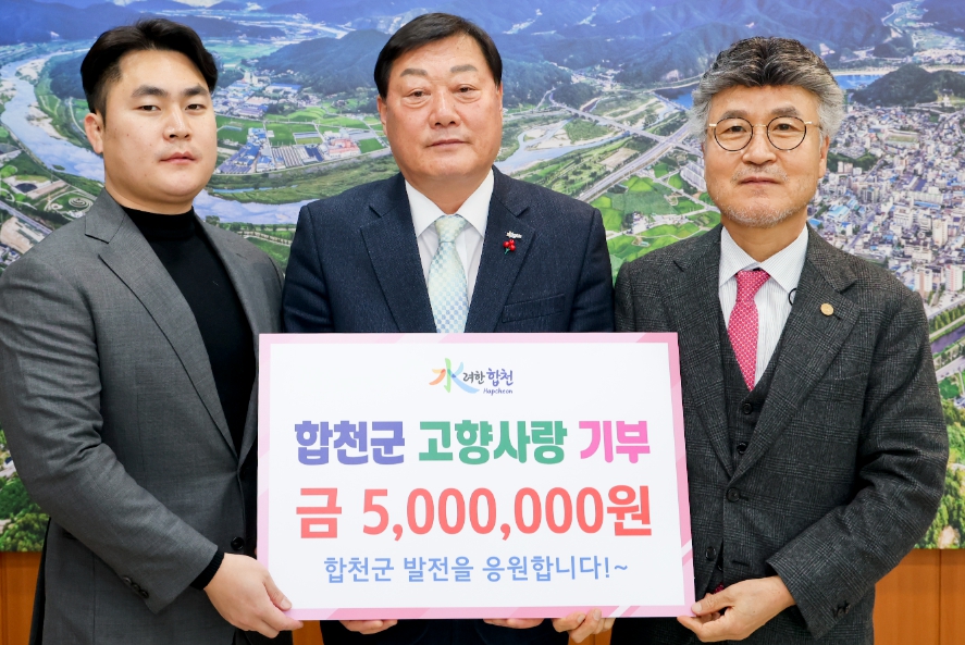 합천군에 고향사랑기부제를 통한 기부 행렬이 이어지고 있는 가운데 ㈜문창 문성호 대표이사가 27일 합천군을 방문해 고향사랑기부제 연간 상한액인 500만원을 전달했다.