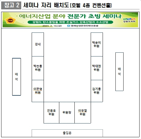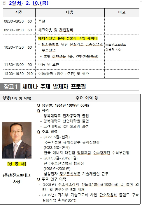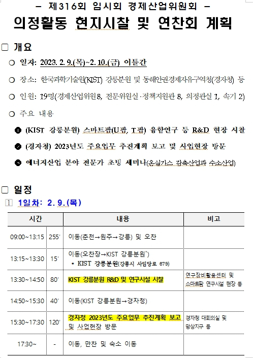 강원도 맞춤형 미래산업 정책 발굴에 앞장서! 2월 9일(목)~10(금), 경제산업위원회 현지시찰 및 연찬회 개최지역 특화형 산업 연구개발 시설 시찰 및 에너지산업 분야 전문가 초빙 세미나 개최 등- 한국과학기술연구원(KIST) 강릉분원 R&D 현장 현지시찰 - 에너지산업 분야 전문가 초빙 세미나(주제: 강원도 탄소중립을 위한 온실가스 감축산업과 수소산업) 정유근 기자 / |