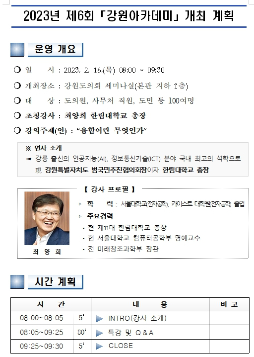 새로운 강원을 여는 아침포럼 ‘2023 강원아카데미’ 본격 운영- 최양희 한림대학교 총장(前 미래창조과학부 장관) 초청, ‘융합이란 무엇인가’ 강연 -정유근 기자 / |