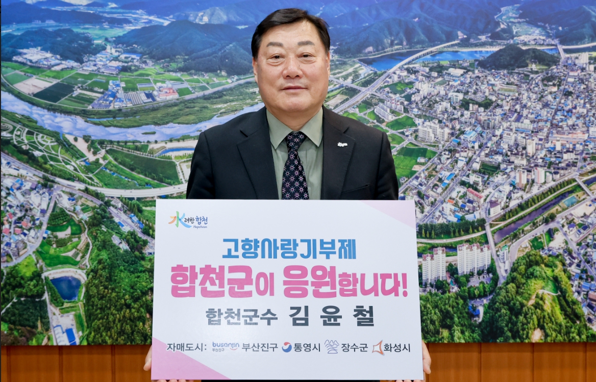 23일 김윤철 합천군수는 시행 초기 단계인 고향사랑기부제의 성공적인 안착과 기부 참여 활성화를 위해 농협은행 군청출장소를 방문해 자매결연 도시인 부산 진구, 통영시, 장수군, 화성시에 고향사랑기부금을 전달했다.