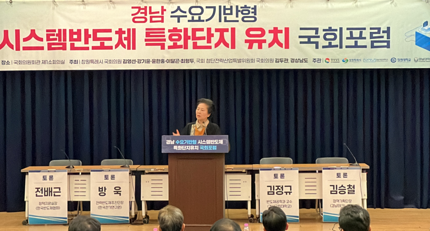 김영선 의원(국민의힘, 경남 창원시의창구)은 6일 오후2시 국회의원회관 제1소회의실에서 ‘경남 수요기반형 시스템반도체 특화단지 유치 국회포럼’을 주최했다. 이번 포럼은 국가 핵심산업이자 미래 신산업의 근간인 반도체산업이 7개월째 연속 역성장을 보이는 등 새로운 발전 계기에 대한 필요성이 제기되는 가운데, 국회에서 대한민국 반도체산업의 경쟁력 확보 방안을 모색하기 위해 열렸다.