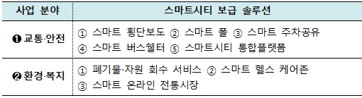 『스마트시티 솔루션 확산사업』은 도시 서비스가 부족한 소도시에 교통‧안전, 환경‧복지에 관련된 효과성이 검증된 스마트 솔루션 패키지를 보급하여 도시 서비스 개선을 목표로 ’20년부터 국토교통부에서 추진하고 있는 사업이다.