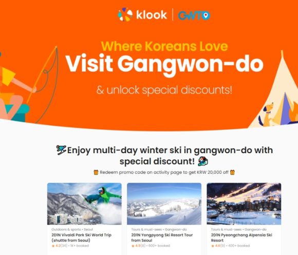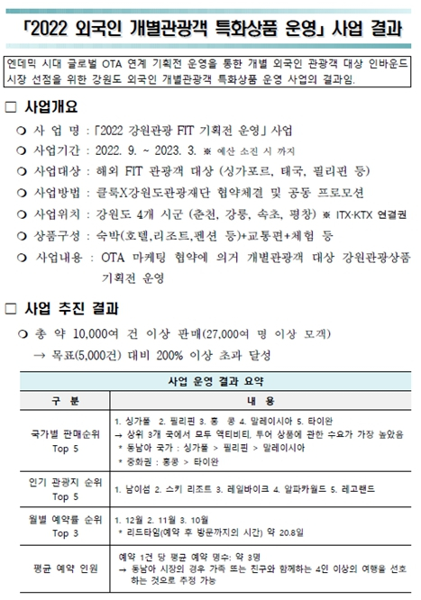 본격적인 국제관광 시장 회복에 대비하여 강원도와 강원도관광재단(대표이사 강옥희)은 글로벌 온라인 여행 플랫폼 클룩(KLOOK)과 강원도를 찾는 외국인 개별 관광객(FIT)을 대상으로 22년 9월부터 23년 3월까지 여행상품 프로모션을 진행했다. 재단은 이번 프로모션을 통해 강원도에 약 27,000여 명의 개별 외국인 관광객이 방문했다고 밝혔다.