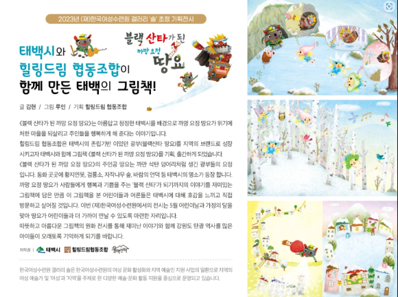 이번 전시는 강원도 태백 지역의 ‘탄광’을 소재로 제작된 지역 창작 그림책 ‘블랙 산타가 된 까망 요정 땅요’의 원화전으로 태백시와 지역의 사회적기업인 ‘힐링드림협동조합’이 함께 제작한 책이다.