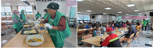| □ 방림면새마을지도자남녀회, 2023년 장수식당 첫 운영 ੦ 지난(5.12) 11:30, 방림면새마을지도자남녀협의회(회장 경민수·이영희)는 방림복지회관 1층에서 2023년 첫 장수식당을 운영하여 관내 어르신 100여 명을 대상으로 점심식사를 대접하였음. ੦ 방림면 장수식당은 작년까지 코로나19의 영향으로 비대면 도시락 조리·포장 전달로 진행하였으나, 올해부터는 방림복지회관과 계촌복지회관을 격주로 방문하며 관내 어르신에게 식사를 제공할 계획임. ੦ 마을 어르신들은 ‘오랜만에 다 같이 얼굴보며 근황을 나눌 수 있어서 행복하다. 든든한 식사를 준비해주셔서 너무 감사하다.’ 등의 뜨거운 반응을 보였음.