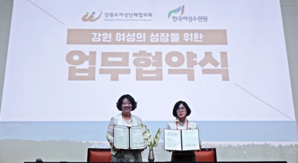 (재)한국여성수련원(원장 고창영)과 (사)강원도여성단체협의회(회장 안정희)는 5월 24일(수) 10시, 강릉시 옥계면 (재)한국여성수련원에서 강원 여성의 성장과 역량개발을 위한 업무협약을 체결했다.