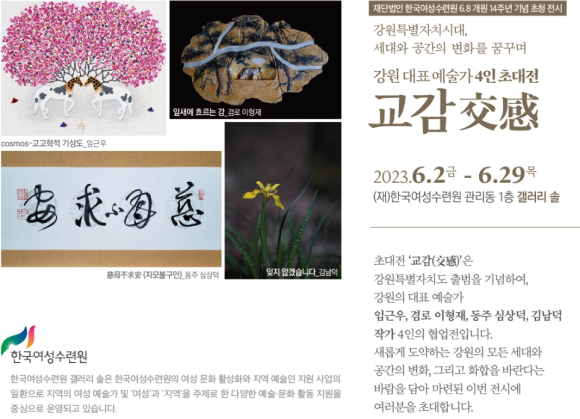(재)한국여성수련원(원장 고창영)이 오는 6월 2일(금)부터 강원특별자치도 출범과 개원 14주년을 기념한 특별한 전시 ‘교감(交感)’을 개최해 눈길을 끌고 있다.