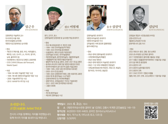 강원도의 대표 예술가로 손꼽히는 임근우(입체), 겸로 이형재(조각), 동주 심상덕(서예), 김남덕(사진) 작가 4인의 협업전으로 구성된 이번 전시는 새롭게 도약하는 강원의 모든 세대와 공간의 변화, 그리고 화합을 위한 바람을 담아 ‘교감’을 주제로 마련되었다.