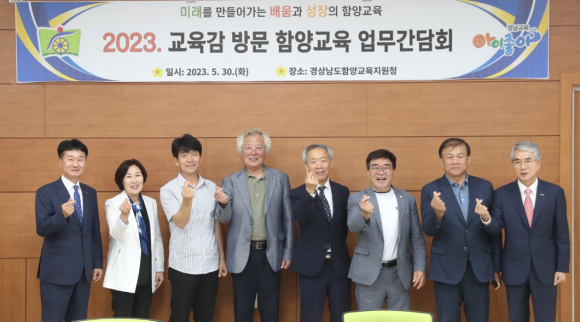 함양교육지원청(교육장 최경호)은 30일(화) 오후 교육지원청 3층 대회의실에서 박종훈 경상남도교육감과 함양 관내 학교장, 학교운영위원장, 학부모대표, 마을교사 대표 등 50여 명이 참석한 가운데 함양교육업무협의회를 가졌다.