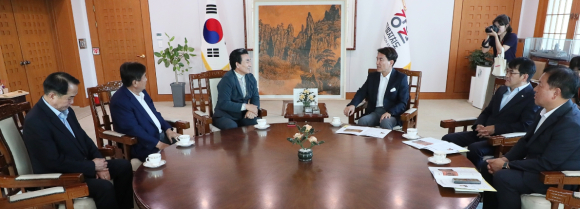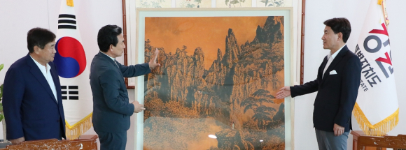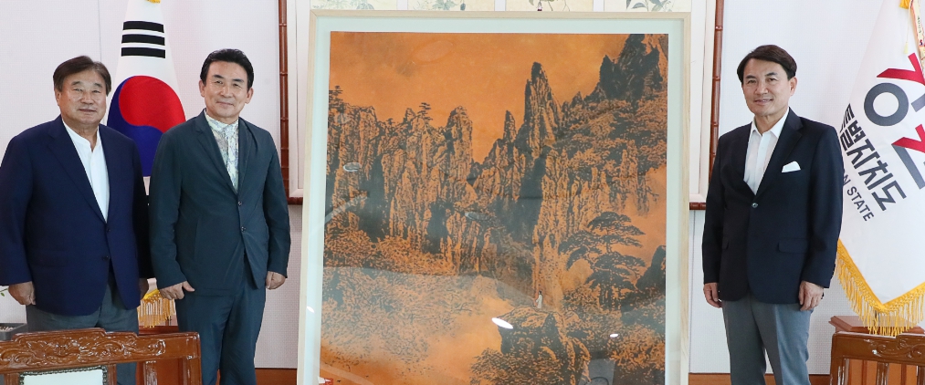 김진태 강원특별자치도지사는 2023. 6. 23.(금) 오후 4시 강원도청에서 전달식을 열고, 춘당 민태홍 화백(삼척 출신)이 강원특별자치도의 성공적인 출범을 기념하여 특별히 제작한 1억원 상당의 ‘금강산 석양 한국화’를 기증받았다.