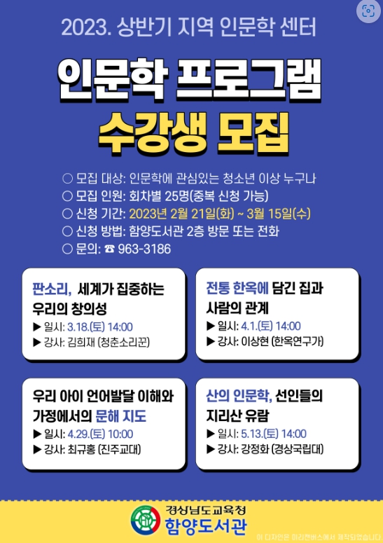 둘째, 셋째 날에는 4차 산업혁명과 미래 기술이 가져올 직업의 변화에 대해 생각해 보고 자신의 미래 모습을 상상해 볼 수 있는 다양한 독후활동이 준비되어 있다. 모집인원은 총 15명이고 운영 대상은 함양 관내 초등학생 4~6학년으로 신청은 7월 11일부터 도서관으로 방문 또는 전화(☎963-3186)로 할 수 있다. 담당자는 “이번 여름독서교실이 아이들이 자신의 꿈과 미래에 대해 진지하게 생각해 보고, 미래 역량을 키울 수 있는 계기가 되기를 바란다.”고 전했다.