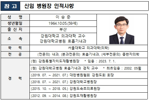 | 신임 이승준 병원장은 서울대학교 의학과(학사), 서울대학교 의학과 예방의학(석‧박사), 강원대학교 최고경영자과정을 마쳤으며 내과전문의, 호흡기내과 분과전문의, 중환자의학 세부전문의 면허를 취득한 의료분야 전문가이다.