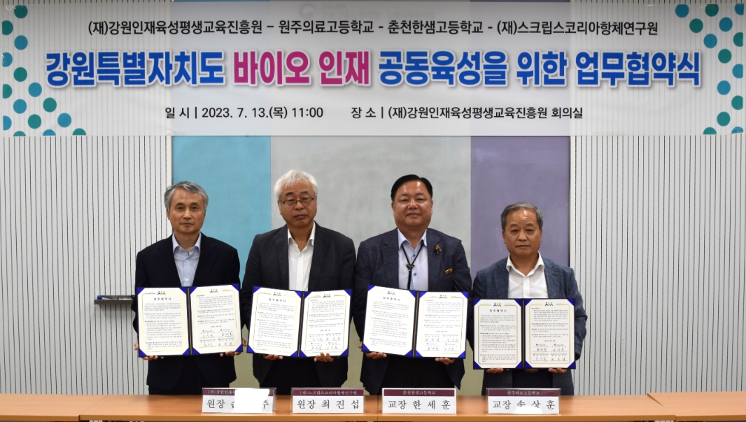 (재)강원인재육성평생교육진흥원(원장 손인주)은 7월 13일(목) 재단 회의실에서 원주의료고등학교, 춘천한샘고등학교, (재)스크립스코리아항체연구원과 ‘도내 바이오 분야 인재육성’을 위한 업무협약을 체결했다.