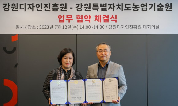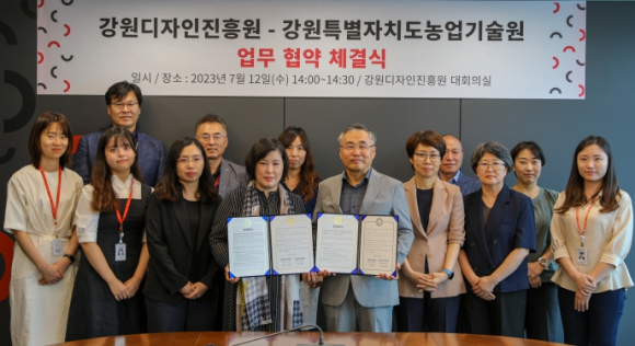 강원디자인진흥원 - 강원특별자치도농업기술원 농가공품 디자인 경쟁력 강화를 위한 업무협약 체결경쟁력 강화를 위한 업무협약정유근 기자 / |