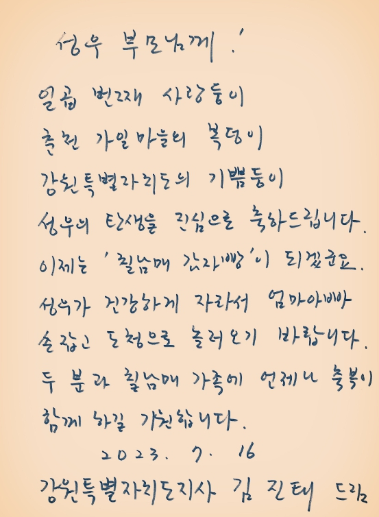 김진태 강원특별자치도지사는 일곱번째 다둥이를 출산해 화제가 되고 있는 춘천 가일마을 전동훈-류사라 씨 부부에게 득남을 축하하는 손편지를 전해 기쁜 마음을 전했다.