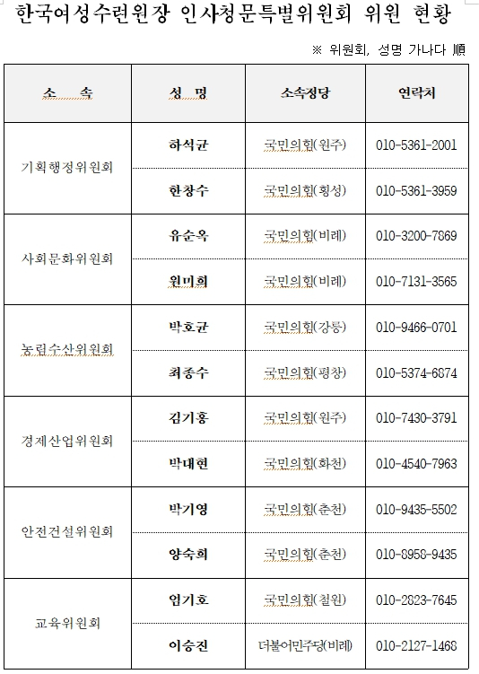 도의회 한국여성수련원장 인사청문특위 가동 준비 완료 !○ 인사특위 위원장에 유순옥 의원(국민의힘,비례), 부위원장에 원미희 의원(국민의힘,비례) 선임○ 8월 말 인사청문 요청 접수 후, 9월 후보자 대상 인사청문회 개최 예정 ○ 여성수련원의 존립 가치와 발전 비전에 대한 후보자의 자질과 역량 검증에 방점 정유근 기자 / |