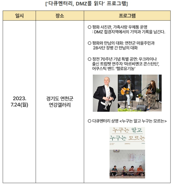| ‘다큐멘터리, DMZ를 읽다’ 첫 번째 장소는 경기도 연천 연강갤러리 다큐멘터리 <누구는 알고 누구는 모르는> 상영, 평화 사진관과 가족사랑 우체통 프로그램 운영 오는 7월 24일(월) 경기도 연천군 연강갤러리에서 ‘다큐멘터리, 소통을 읽다’라는 주제로 첫 번째 행사를 진행한다. 연강갤러리는 휴전 이후 민통선 내에 건립된 최초의 예술공간으로 접경지역이라는 지정학적 조건 아래 온전히 보존된 연천군의 생태와 동시대의 문화예술이 만나는 복합 공간이다. 연강갤러리 1층 로비에서는 DMZ 접경지역 마을 주민 및 장병을 대상으로 자신의 모습을 사진으로 기록할 수 있는 평화 사진관과 가족에게 사진과 편지를 보내 그동안 전하지 못했던 마음을 전달하는 가족사랑 우체통을 준비한다. 연강갤러리 앞마당에서는 연천군 마을주민과 28사단 장병들이 소통의 시간을 갖고, 정전 70주년 기념 특별 공연으로 우크라이나 출신 트럼펫 연주자 ‘마트비옌코 콘스탄틴’과 어쿠스틱 밴드 ‘헬로유기농’이 무대에 오른다. 공연 이후에는 DMZ Docs가 선정한 다큐멘터리 <누구는 알고 누구는 모르는>(배꽃나래 감독)의 상영이 이어진다. 감독이 한글을 배우기 시작한 자신의 할머니를 담아낸 작품으로, 힘든 삶 속에서 서로를 지탱한 여성들의 우정과 소통을 다룬다.