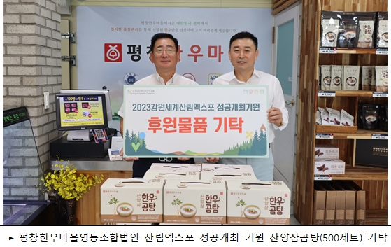 평창한우마을영농조합법인(대표 최일락)에서 7월 27일(목) ‘2023 강원세계산림엑스포’ 성공개최를 기원하며 (재)강원세계산림엑스포조직위원회(조직위원장 김진태)에 2천만원 상당(500세트)의 현물(산양삼곰탕)을 기탁했다.