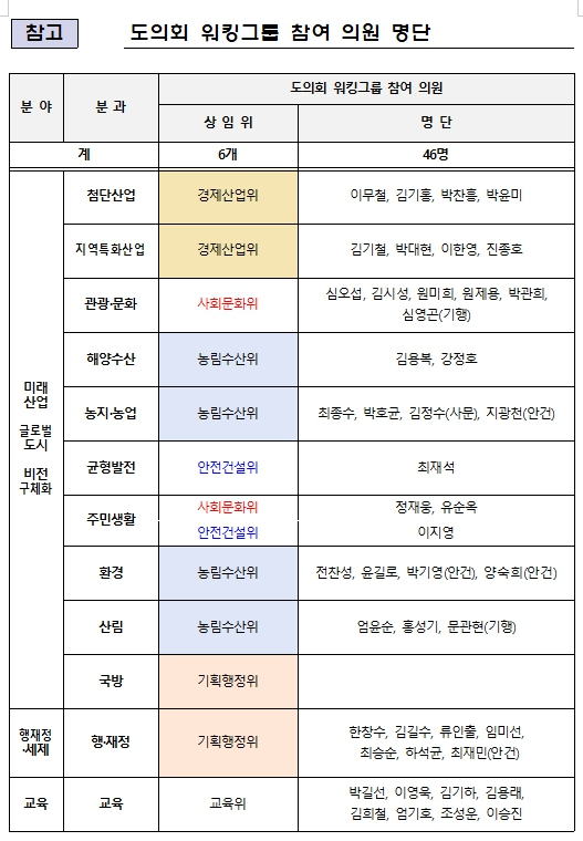 워킹그룹은 ‘미래산업글로벌도시’ 비전 구체화 분야, 행정·재정·세제 분야 및 교육의 3대 분야에 12개 분과로 구성되어 있으며, 각 분과에는 도의원을 비롯해 도 실·국, 시·군 및 도 교육청 공무원들과 분야별 전문가 등이 참여하여 9월까지 활동할 예정이다.