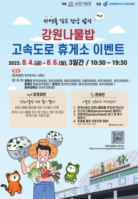 강원특별자치도농업기술원(원장 임상현)은 오는 4일(금)부터 6일(일)까지 사흘간 여주휴게소 상행선(인천방향)에서 강원나물밥 홍보행사를 강원특별자치도경제진흥원, 한국도로공사 강원본부와 협력하여 진행한다고 밝혔다.