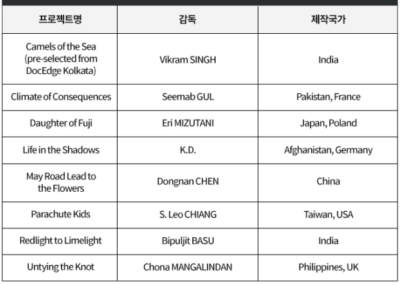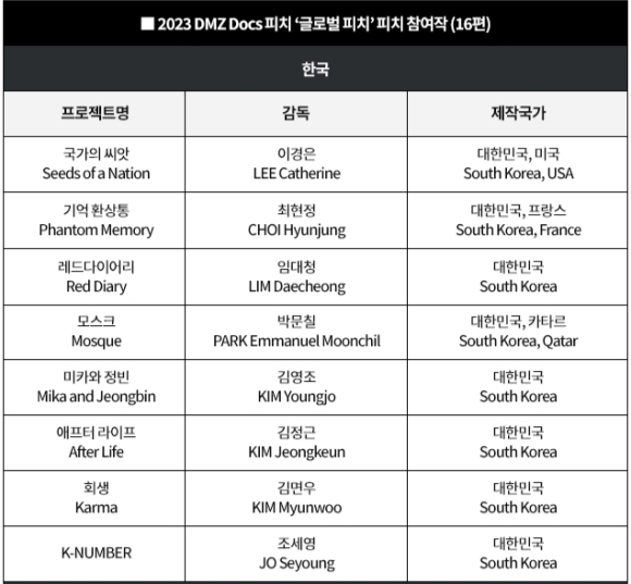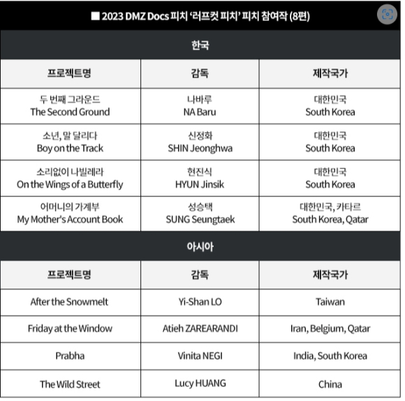 | 지난 5월 22일부터 6월 14일까지 진행된 DMZ Docs 피치 프로그램 접수에는 37개국 총 123편이 신청했으며 글로벌 피치와 러프컷 피치 모두 한국과 아시아로 나누어 국내외 다큐멘터리 전문가로 구성된 심사위원단이 심사를 진행했다. 글로벌 피치 한국 프로젝트는 오정훈 DMZ Docs 부집행위원장, 정주리 감독, 조지훈 무주산골영화제 프로그래머가, 아시아 프로젝트는 감병석 프로듀서, 김선아 DMZ Docs 인더스트리 프로듀서, 카림 애투나 프로듀서가 맡았다. 러프컷 피치 한국 프로젝트는 이연정 편집감독, 장병원 DMZ Docs 수석 프로그래머, 진모영 감독이, 아시아 프로젝트는 김선아 DMZ Docs 인더스트리 프로듀서, 파트리치아 만시니 컨설턴트, 울디스 세쿨리스 프로듀서가 맡았다.